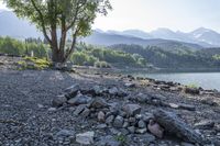 rocks on the shore of a lake in front of mountains and trees in the distance is a bench on the rocks
