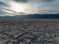 a photograph of the sun over a salt field with mountains behind it and waves and clouds