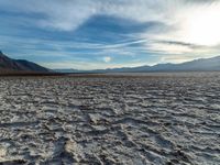 A serene desert landscape at dawn, with a small body of water reflecting the sunlight. Sand dunes and open spaces create a sense of vastness. Off-road track disappears into the horizon.