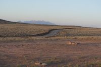Dawn breaks over the vast desert landscape of Utah's San Rafael Swell. Elephant-shaped rock formation stands among the red rocks and vegetation. Off-road track leads through the grassy plains, surrounded by majestic mountains.