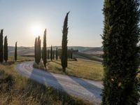 A scenic view of a curving dirt road in the Tuscany region of Italy. The rugged landscape is adorned with cypress trees and a vibrant garden in the foreground. The clear sky and visible sun illuminate the picture with warm sunshine.