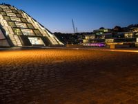 a triangular pyramid sitting on top of a brick road next to some buildings at night
