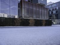 This photo showcases a high-rise building in a residential area. The building's facade and large windows are prominent features, reflecting the urban design. The image captures a cold winter day with snow covering the sidewalk in front of the building. The contrast between the white snow and the building's structure creates a visually striking scene. This photo represents the combination of architectural design and the winter season. It is a perfect representation of urban living in a snowy environment.