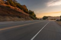 a truck driving on the highway during sunset on an empty road near the mountains,