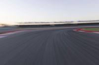 A race track at dawn, with a straight road leading to the grandstand. The asphalt reflects the clear sky, creating a beautiful motion blur effect. The infrastructure of the track provides a perfect setting for high-speed racing.
