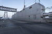 Dawn breaks as cars speed along a highway, passing under a metal bridge. The asphalt road surface and motion blur gives a sense of movement. Clear sky above adds a touch of serenity.