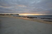This image captures a stunning coastal landscape during the break of dawn. The beach stretches out in front, with the ocean reflecting the vibrant colors of the sky. The sun is visible, casting a warm and inviting glow over the scene. The concrete sidewalk provides a path for recreational activities along the shore. The open space and serene atmosphere make this the perfect spot for enjoying nature and basking in the sunshine. The grey sky adds a touch of gloominess, creating a unique and dramatic contrast. This photo captures the beauty of the beach and the tranquility of the ocean.