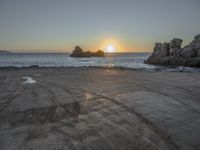 This is an image of a coastal landscape at dawn in Portugal, Europe. The open space allows for a breathtaking view of the ocean horizon. The wooden bank creates a peaceful atmosphere and the surface of the water reflects the clear sky. The sunlight shines brightly, creating a sunny and tranquil environment. This photo captures the beauty of the natural coastal environment and showcases the water resources of Portugal. It is the perfect representation of the break of day and the afterglow of the sun visible over the beach.