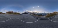 Austria's breathtaking mountain landscape captured in the early dawn. The open space overlooks a clear sky, with a circular lens effect adding a unique touch. The road leads to a parking lot, offering an overview of the stunning nature.