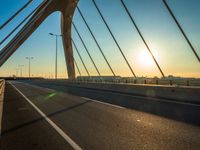sun setting over the bridge, with cars driving along in distance, on a bridge