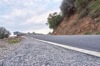 A low angle view of a road in California, USA during dawn. The asphalt road winds through the mountainous landscape, surrounded by the beauty of nature on a clear day.