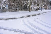 This is an image of a gloomy winter morning in Ontario, Canada. The grey sky casts a gloom over the landscape, with snow covering the ground and trees. In the distance, a residential area can be seen, with houses and fences lining the road. The road surface is covered in snow, making it slippery in the freezing conditions. A tree with bare branches stands near the road, adding to the winter scenery. This photo captures the rural beauty of Ontario in the wintertime.