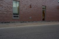 This is an image of a cityscape in Toronto, Ontario, Canada. The photo was taken at dawn, capturing the break of day with a clear sky. The asphalt road surface and brickwork of the buildings create an urban design. The image showcases the diverse neighborhoods and properties in the city, with windows and wood fixtures visible on the buildings. The photo also highlights the curbs and surfaces of the streets. This image represents the vibrant and artistic district of Toronto, with its distinctive brown brick buildings.