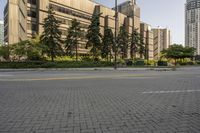 This is an image of a modern residential area in Toronto, Canada. The picture captures the cityscape during the break of day, with a clear sky and a yellow hue casting over the urban landscape. The architecture of the buildings and the road surface in the foreground are modern and sleek. Trees dot the neighborhood, providing a touch of greenery to the metropolitan area. The image showcases the urban design of Toronto, capturing the essence of city life in this bustling Canadian city.