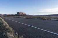 This is an image of a road in Utah, USA at dawn. The asphalt road cuts through the desert landscape, surrounded by red rock mountains. The clear sky and scattered clouds enhance the beauty of the natural scenery. The road surface reflects the early morning light, creating a stunning visual effect. This photo captures the unique geology of the area, showcasing the badlands and canyonlands of Utah. In the distance, contrails can be seen in the sky, adding an element of movement to the tranquil scene. Embark on a road trip through the beautiful landscapes of Utah's Needles region.