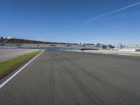 This image captures a race track in Valencia, Spain during the dawn. The straight road is made of asphalt and stretches into the distance, providing a perfect path for sports and racing activities. The road surface features a smooth pattern and is flanked by green grass on both sides. The race track is surrounded by a clear sky with a few clouds in the distance, giving it a serene and picturesque atmosphere. With its sleek design and European charm, this race track in Valencia is an ideal destination for race enthusiasts and sports lovers alike.