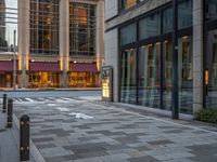 A view of Tokyo's bustling city life at dawn, with the artificial light illuminating modern office buildings and business districts. The city's urban design features paver roads, storefronts, and vibrant shops. A glimpse of modern architecture in Japan.