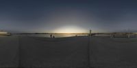 A serene coastal landscape in Lisbon, Portugal at dawn. The sun casts a warm glow on the calm ocean, creating a stunning red sky. A person stands on a skateboard, enjoying the peaceful atmosphere.