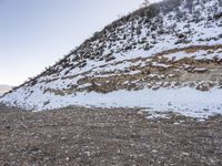 This image captures the beauty of a winter landscape at dawn. The photo showcases a dirt road that winds through the rugged terrain of the highlands, surrounded by mountains and open spaces. Fresh snow can be seen covering the ground and tundra, creating a serene and peaceful atmosphere. The rocky cliffs and slopes add to the geology of the area, making it a unique and picturesque scene. With the clear sky above, this photo represents the untouched beauty of nature in winter.
