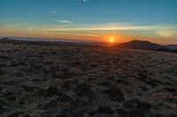 there is a sunset in the horizon on a field with grassy land below the mountains