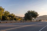 This is an image of a rural road at dawn surrounded by mountains and trees. The asphalt road surface leads through the highland landscape, with hills in the distance. Sunlight breaks through the clouds, casting a warm glow on the vegetation alongside the road. Guard rails and an Armco barrier provide infrastructure and safety measures. This scenic photo captures the peacefulness of a rural area early in the day, with the road stretching into the horizon. It represents a typical morning scene in the countryside.