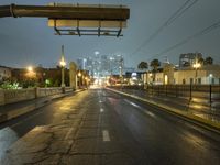 A dark and gloomy night in Los Angeles. The wet road glistens under the glow of city lights, reflecting the low-hanging clouds. The urban cityscape and towering skyscrapers create a stunning backdrop.