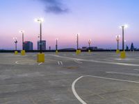 an empty parking lot with street lights next to it at dusk, taken from the road