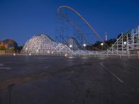 A scenic view of the iconic Los Angeles skyline at dawn. The clear sky contrasts with the dark silhouette of nonbuilding structures. The city's famous amusement park comes to life as the lights of the roller coaster illuminate the night. A must-visit tourist attraction in California, USA.