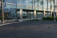 A modern architecture building in the heart of the bustling city. Clear sky at dawn illuminates the metropolitan area. Office buildings, mixed-use properties, and parking lots create a vibrant urban design.