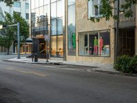 the store fronts and the trees are reflecting the windows of a city building as well