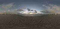 A captivating fisheye view of the Miami Beach coastline at dawn. The golden sunset creates a mesmerizing circle, with tracks leading from the sandy open space to the sparkling ocean. A perfect day in Miami, Florida.