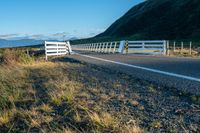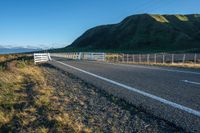 a highway going along the side of a grassy hill with a fence on it in a remote area