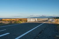 A scenic rural road in New Zealand at dawn. The asphalt road stretches into the horizon, lined with a fence. A white horse stands on top of the fence, casting a hard shadow on the road. The sky is filled with clouds, creating a beautiful contrast with the break of day. This peaceful image captures the serenity of a rural setting in New Zealand.