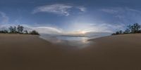 Panoramic view of the calm ocean at dawn, with an empty beach and trees in the background. The serene landscape offers a reflection of the clear blue sky and creates a peaceful atmosphere. A perfect day to explore the coastal beauty of Phuket, Thailand.