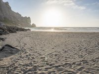 A stunning view of the California coast at dawn. The image showcases the expansive sandy beach, the serene water surface, and the open space surrounding it. The natural environment is adorned with fog, creating a gloomy yet captivating atmosphere. The rocky shore meets the sea, as the clouds blend into the horizon. This beach serves as a popular recreational destination, offering various activities such as sunbathing, lake exploration, and wave watching. Despite the grey sky, the sun is visible, casting a gentle sunshine over the landscape.