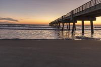 This is an image of a beautiful coastal landscape at dawn in Florida, USA. The open space contains sandy beaches and crystal clear water, with waves gently crashing onto the shore. In the distance, a pier extends into the ocean with a clear sky and horizon beyond. The image captures the serenity and natural beauty of the Florida coastline. It is a perfect representation of the recreational and emotional connection that people have with nature and the sea.