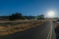This image captures the beauty of dawn in the countryside. The clear sky is illuminated by the first rays of the sun, casting a warm glow over the landscape. A car can be seen driving along the rural road, with the sun visible above it. The asphalt road surface stretches into the distance, surrounded by trees and vegetation. The image depicts a peaceful and serene scene of rural life. With the sun shining and the open road ahead, it's the perfect day for a drive in the countryside.