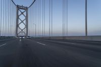 This is an image of a dawn sky with a clear blue atmosphere. The image captures a suspension bridge in the distance, spanning over a highway and multiple lanes. The road surface is asphalt and there is a motion blur effect, emphasizing the movement of vehicles on the road. The bridge is a cable-stayed bridge, adding a unique architectural element to the infrastructure. This photo represents the break of day and the beginning of a new journey.