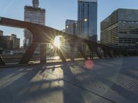 This image captures the skyline of downtown Chicago, Illinois, USA. The cityscape features towering skyscrapers and a concrete bridge. The clear sky is illuminated by the sunrise, casting shadows and creating reflections on the road surface. The metropolis is a bustling urban hub with a vibrant metropolitan area. The sunlight shines on the city, highlighting its architectural beauty. This photo represents a sunny day in Chicago, showcasing the city's impressive skyline and modern infrastructure.