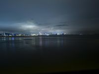 This image captures the tranquil beauty of a coastal cityscape at dawn in Shenzhen, Guangdong, China. The calm water of the ocean reflects the colorful skyline and the artificial lights of the city, creating a mesmerizing atmosphere. The dark horizon and the clouds in the sky add to the dramatic effect. This photograph encapsulates the unique combination of natural and urban elements that China's coastal cities offer. It portrays the serene tranquility that can be found in the early morning hours, showcasing the beauty of Shenzhen and its position as a modern Asian metropolis.