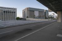 This is an image of an empty city highway in Los Angeles, California, USA. The modern architecture buildings line both sides of the road, representing the vibrant city life in this metropolitan area. The clear sky above contrasts with the high-rise office buildings and the residential areas in the distance. This photo captures the urban design and infrastructure of the city, showcasing the business district during the break of day. The lane markings on the asphalt road symbolize the bustling urban environment. Experience the dynamic energy of this bustling city with this captivating image.