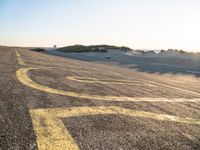 a long winding road with many markings on the ground next to a beach and sand dunes