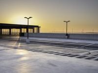 A beautiful architectural building reflected in the still waters of a lake during the early morning sunlight. The asphalt road surface leads towards the horizon, with street lights illuminating the tints and shades of the surrounding landscape.