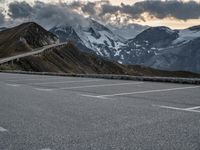 This is an image of a dramatic dawn in Austria. The picture captures the clear sky and the glacial landscape, with mountains and highlands in the background. The asphalt road leads to an open space, with trees and vegetation on either side. In the distance, there is a parking lot overlooking the plain. This photo represents the stunning natural beauty of Austria, making it an ideal destination for recreational activities. Whether you are arriving or just enjoying the view, the breathtaking landscape and dramatic sky will leave you in awe.