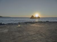 A breathtaking coastal landscape in Portugal at dawn. The sun visible over the ocean creates a magical afterglow. The clear sky and open space reflect the beauty of nature. Sunlight illuminates the beach, waves, and horizon.