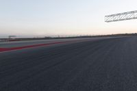 A straight road at dawn, lined with asphalt and surrounded by a clear sky. The motion blur in the POV hints at high-speed racing on a race track. The horizon stretches far, creating a sense of freedom and adventure.