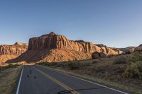 A picturesque dawn on a road that winds through a low desert. The asphalt stretches out in front, leading to majestic mountains in the distance. Explore the rugged terrain of this national park's wilderness and geology.