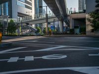 A stunning profile of Tokyo's urban landscape at dawn. The city comes alive as business district lights illuminate modern architecture. Hard shadows and underpasses create a dramatic urban design.