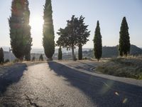 A picturesque view of a rural road in Tuscany, Italy during dawn. The asphalt road curves through the rugged countryside, surrounded by lush vegetation and tall cypress trees. The sunlight creates long shadows, adding depth and warmth to the landscape.
