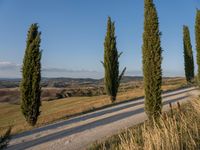 A serene dawn in rural Tuscany, Europe. The rugged landscape is adorned with charming old gardens and cypress trees. Gravel road leads to a bountiful harvest. Clear sky completes the picturesque scene.